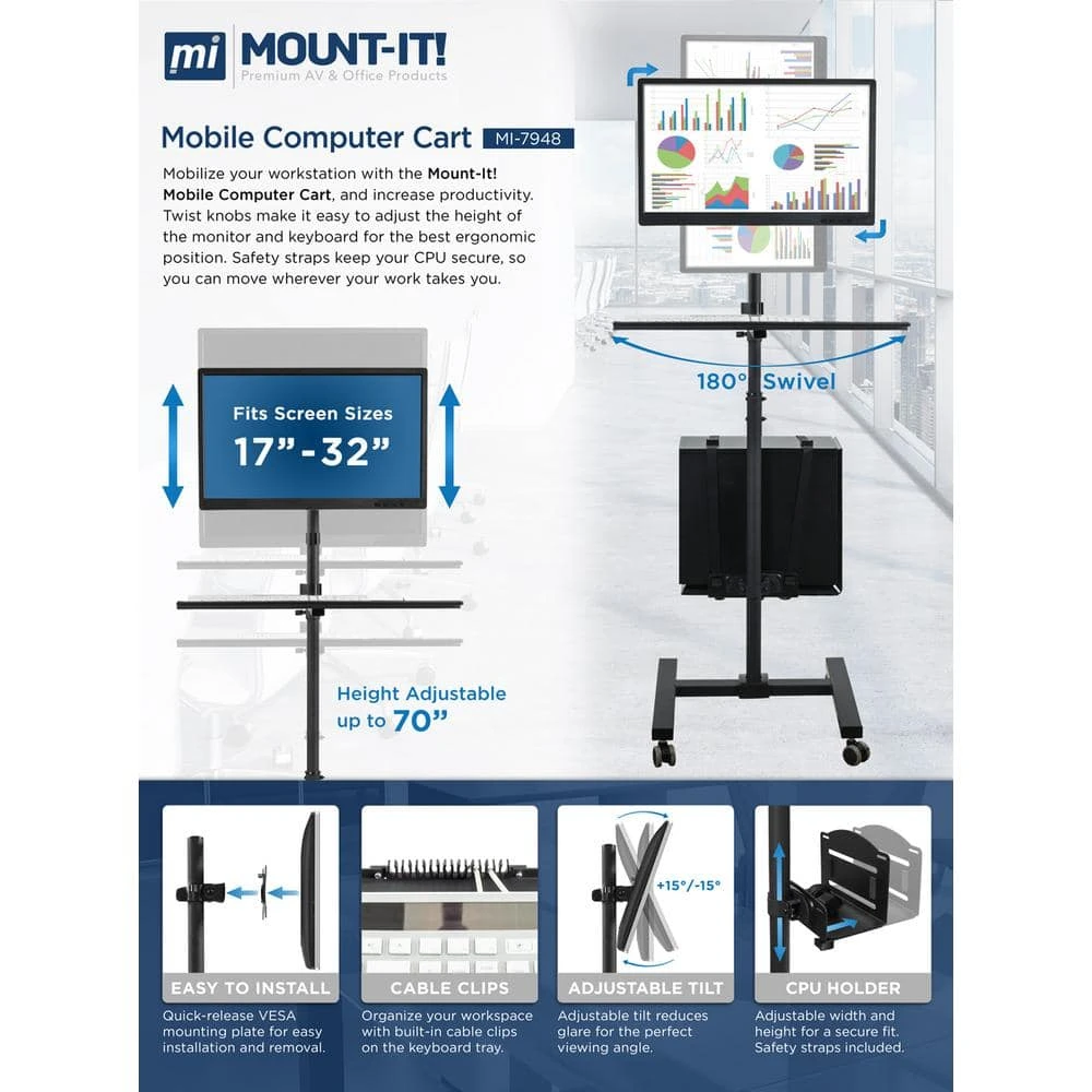 MI-7948 is a 70 in. tall computer cart and the perfect option if you need to mount your monitor, keyboard, and CPU on a rolling stand. The VESA bracket is height adjustable, tilts up or down 15°, supports 17.6 lbs., and swivels and rotates 360° for optimal viewing. A simple twist knob allows you to quickly adjust the 25.7 in. x 9.6 in. full-sized, keyboard tray to a comfortable, ergonomic typing position. The floating CPU holder is height and width adjustable to fit almost any desktop computer, and the buckle straps keep your CPU secured. The steel frame has a stable 19.5 in. W x 19.6 in. D base with 4 durable caster wheels, making it easy to roll it where you need it.