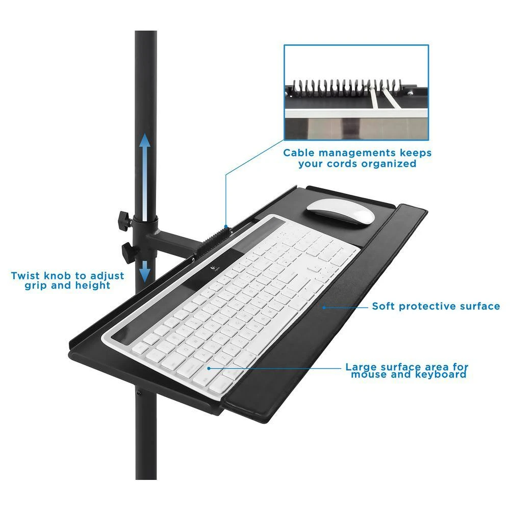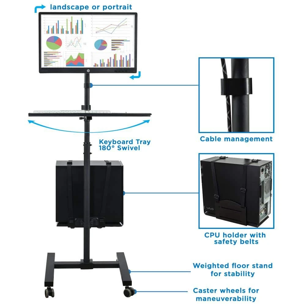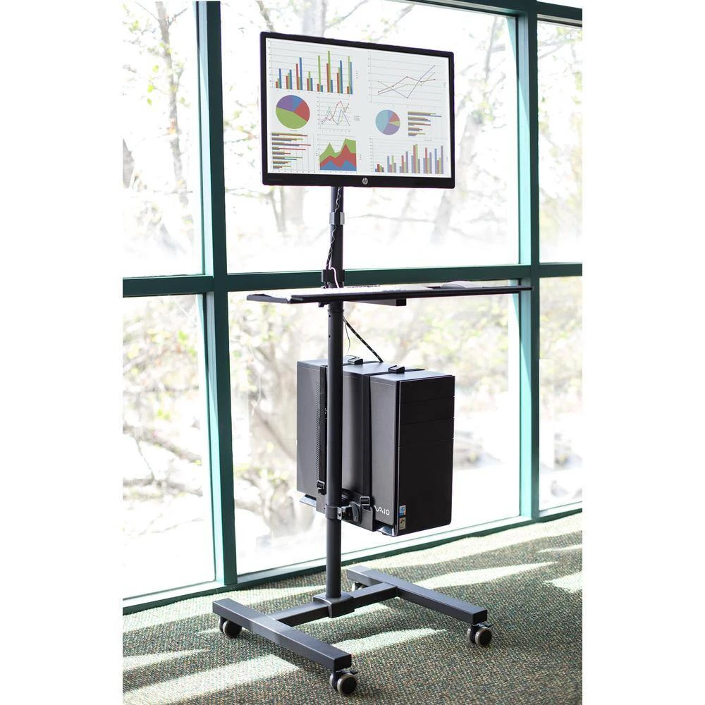 - This tall, 70″ computer cart is the perfect stand-up option if you need to mount your monitor, keyboard, and CPU on a rolling stand
