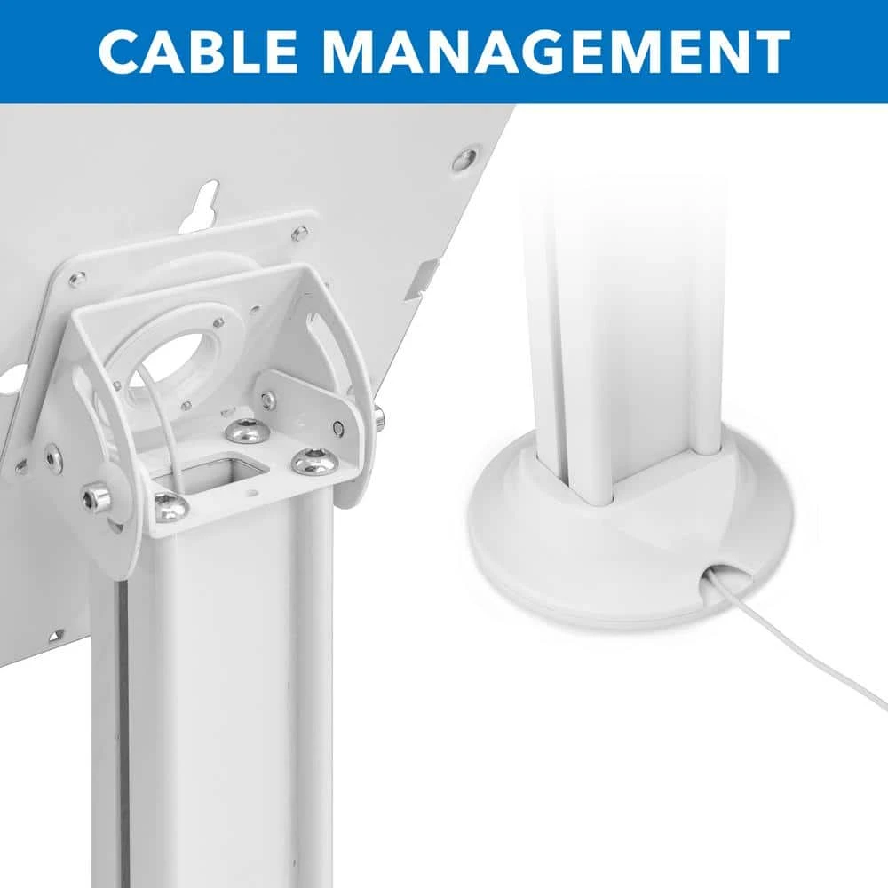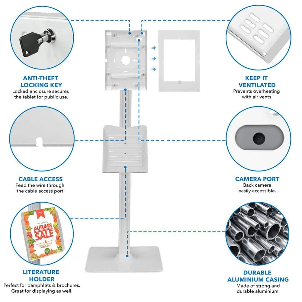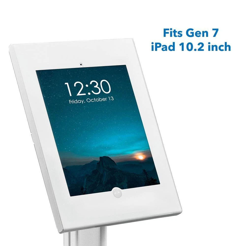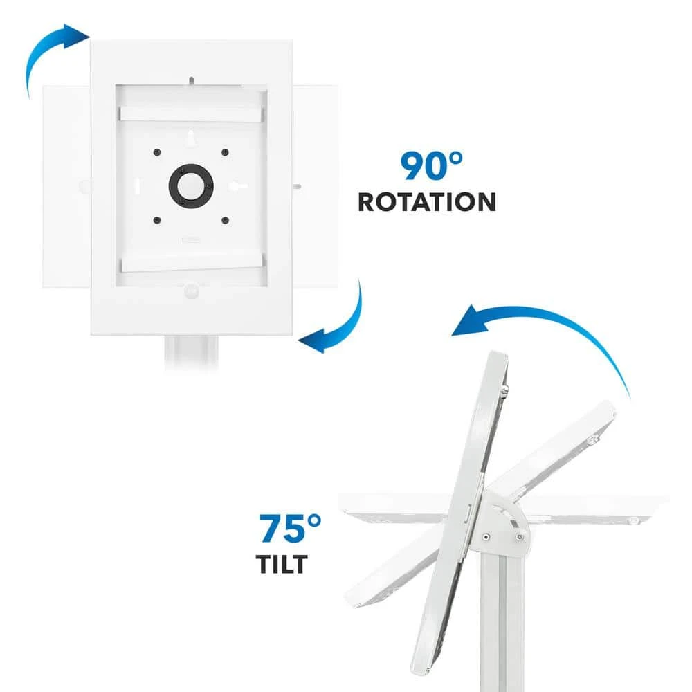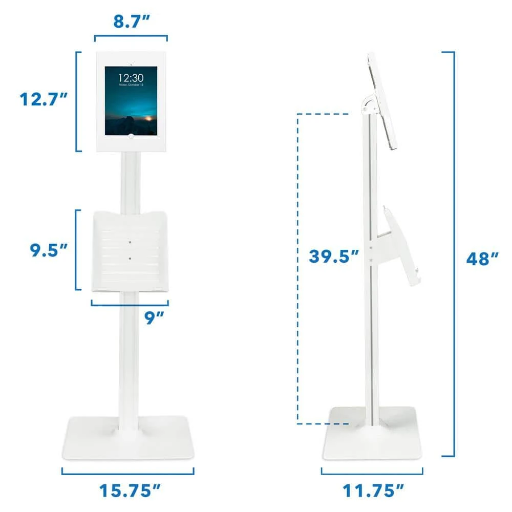 The MI-3770_G8 iPad floor stand is professional, slim, and easy to use. Ideal for use as an iPad POS or check-in kiosk at trade shows, churches, clinics, lobbies, and more. With its large, wide base you can use it freestanding or bolted down for added security. The tilting mount allows you to reverse the screen between users for completing transactions, signing documents, and verifying information. Height adjustable pole helps engage with customers, patients, or guests of any age and size. The keyed lock enclosure ensures your tablet is safe when on display, protecting it from tampering or theft. Cable management system keeps your display clean and organized by hiding wires inside the pole.