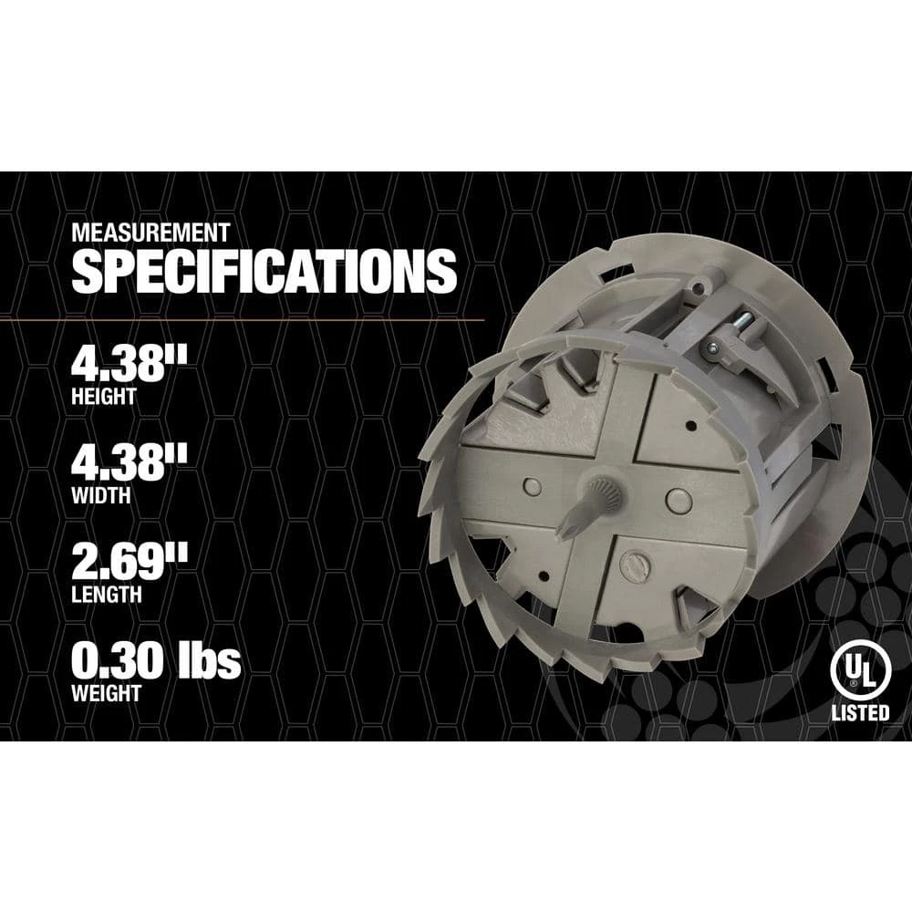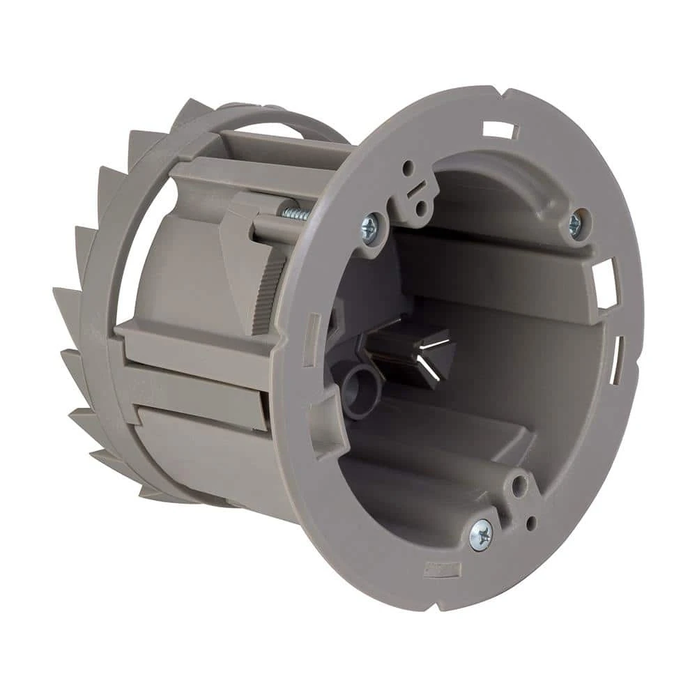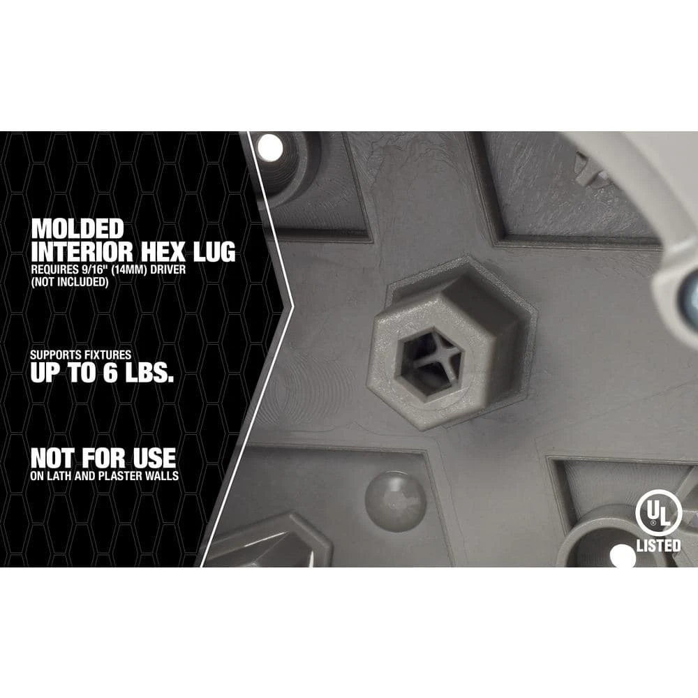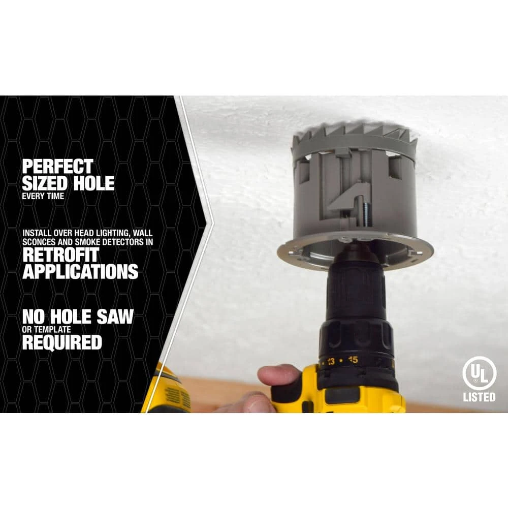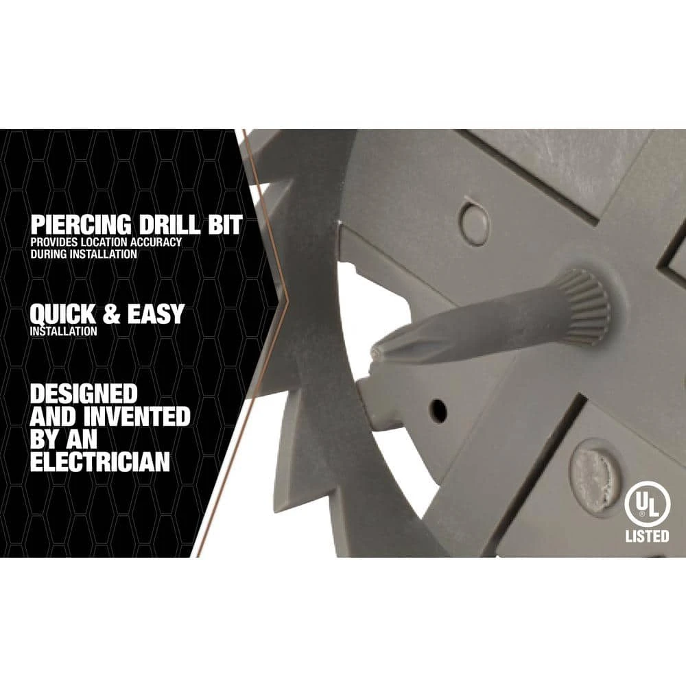 The built in hole saw creates the perfect sized hole every time. A piercing drill bit located at the center of the blade allows for location accuracy during installation. Raised mounting rings with center hole are located inside the back wall of the box for surface mount installations, basement or attic studs. Requires 9/16 in. driver (not included). Supports fixtures up to 6 lbs. 2-1/2 In. deep. Volume 16.5 cu. in.