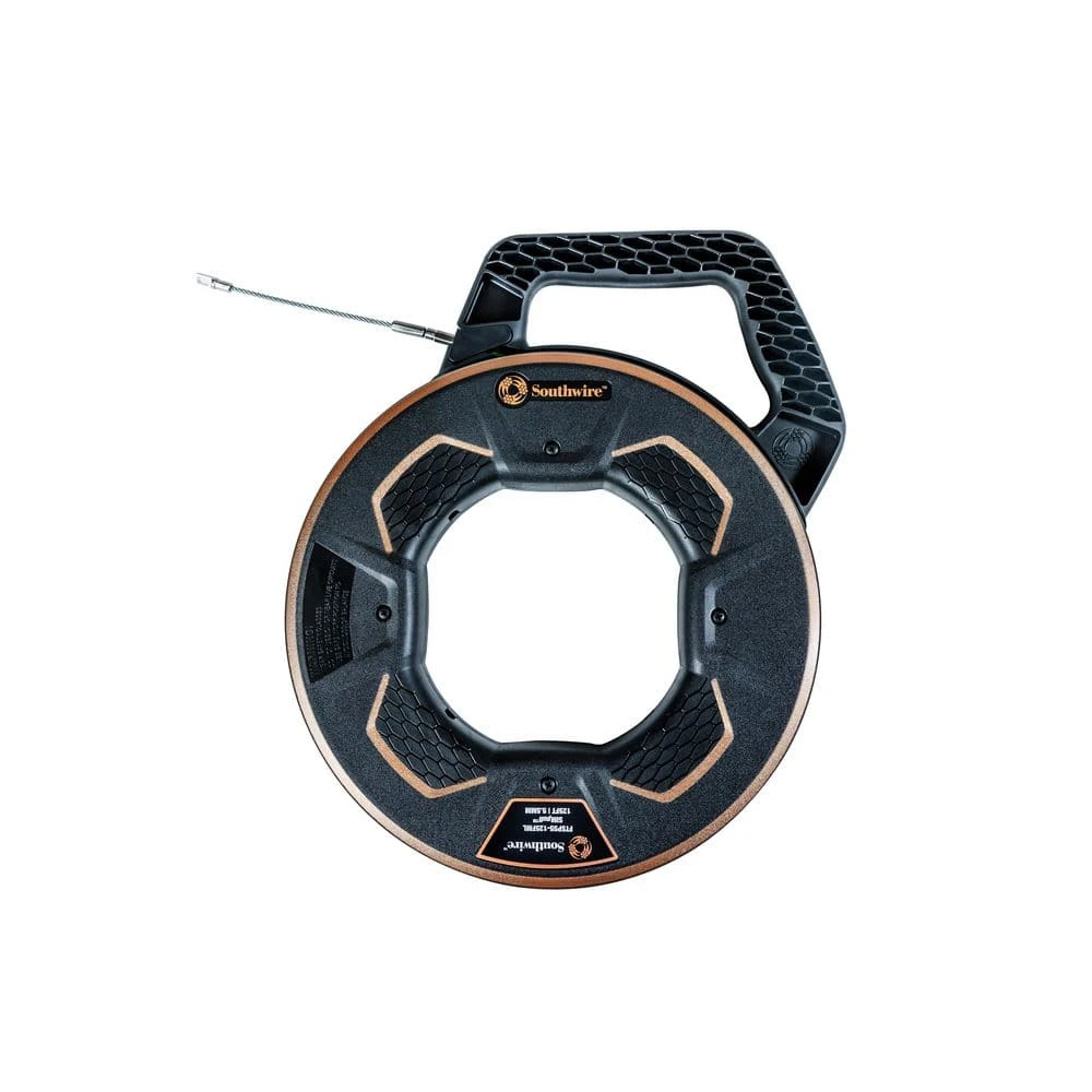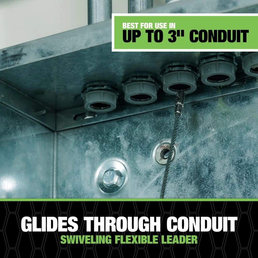 The SIMpull Flexible Metal Leader Fish Tape excels at gliding through conduit with multiple bends. The spiral extruder polymer tape reduces the amount of effort required to push or pull the tape through EMT or PVC conduit. Its swiveling flexible leader easily glides through conduit bends and around existing wire. Its advanced tape guide and housing provides improved internal mechanics to greatly increase efficiency of both payout and reel-in. Additionally, this fish tape has a drop rating of 15 ft.