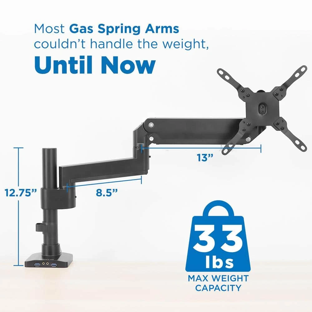 - Gas spring arm with full motion movements and a 33lb load capacity capable of supporting large screens – One of the only gas spring mounts on the market to support this heavy weight capacity