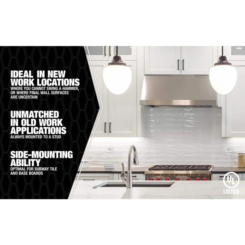 Designed with the electrician in mind. The Original Smart Boxes are unmatched in versatility in new work locations where you cannot swing a hammer, or where final wall surfaces are uncertain, like kitchens and baths. They are unmatched in old or retro it work applications because they are always mounted to a stud. Before Smart Box all other manufacturers hung their cut boxes on flimsy 3/8 or 1/2 sheet rock, or even worse lathe and plaster. Our Original Smart Boxes are unmatched in adjustability, as they are molded entirely of 1 piece with no moving parts to break or lose.