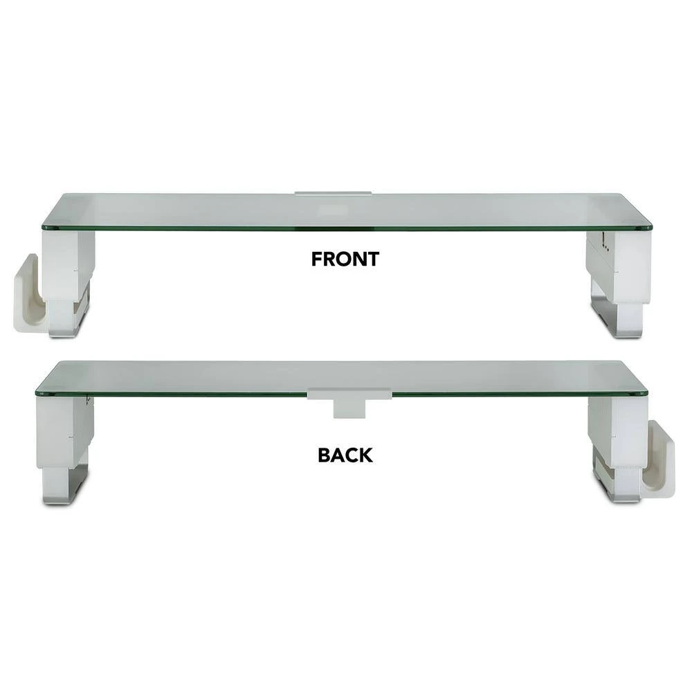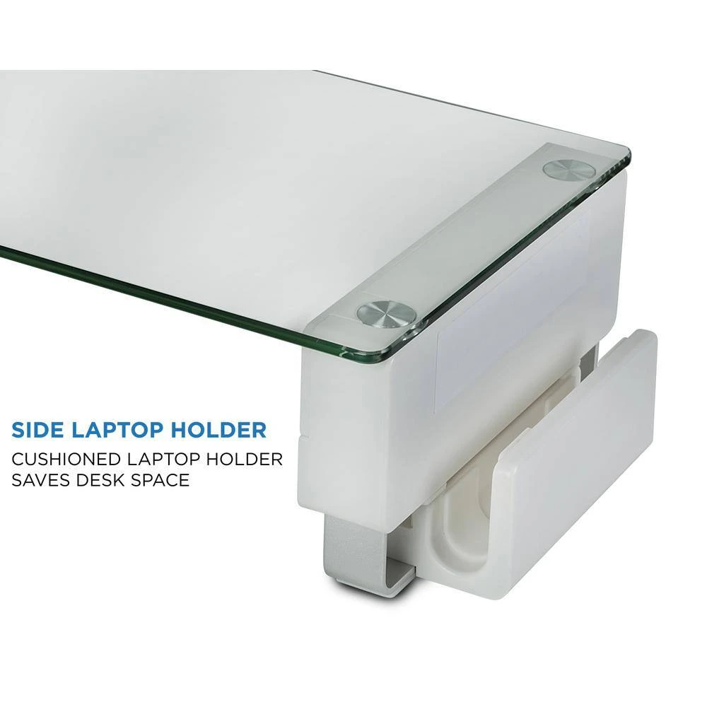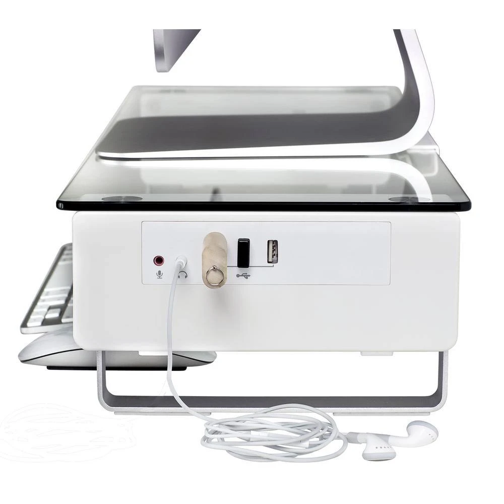 The MI-7265 is a sleek riser that can support monitors, printers or even laptops. Tempered glass and aluminum design will look contemporary in your workspace. The cushioned side-well adds storage space, fitting most laptops or tablets. Raise your monitor up to open up desk space under the riser and create a more ergonomic working environment. 3 USB integrated ports keep everything you need at your fingertips. The durable materials can store up to 66 lbs.