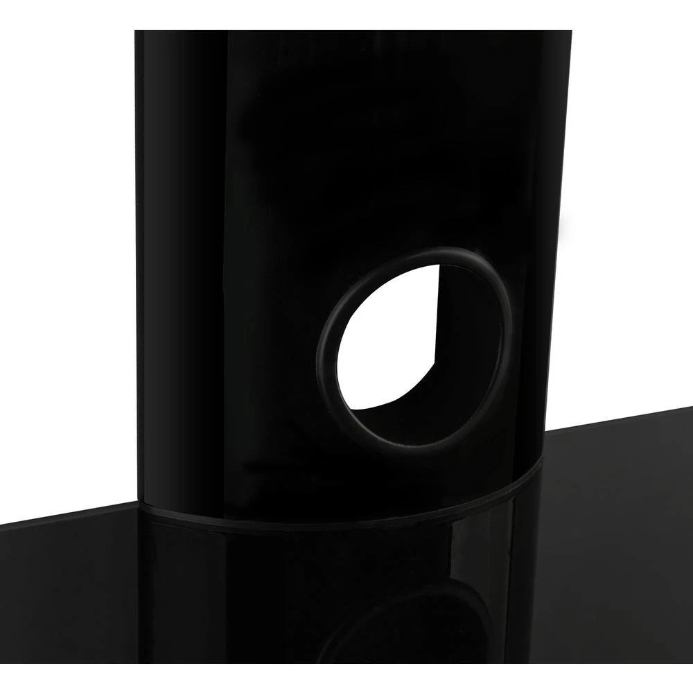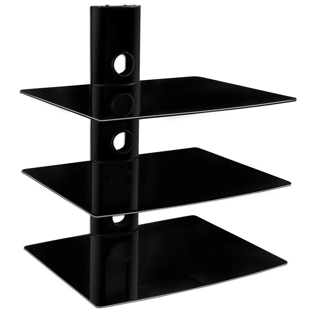 The MI-803 floating wall mounted triple glass shelf will look sleek in your living area. The black tempered glass is oversized to support various equipment. Each shelf can support up to 22 lbs. so you can store and keep your components organized. Convenient cable ports and integrated channel wire help conceal wires and keep your space tidy.