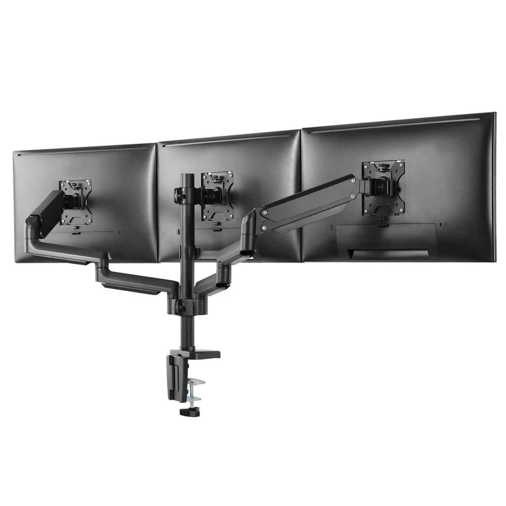 Our triple monitor stand is used by professional level gamers, industry known videographers and filmmakers, digital entrepreneurs and top employees at home or in the office. This mount features 360° rotary VESA plates with a built-in free tilt design. This means you can position your 1, 2 or 3 monitors flush together or spaced out and tilt them upward or downward to reduce strain on your neck. The mount includes integrated cable management channels in each arm keeps AV and power cords organized. Comes with both clamp and grommet bases to fit most desktops up to 3.3 in. thick.