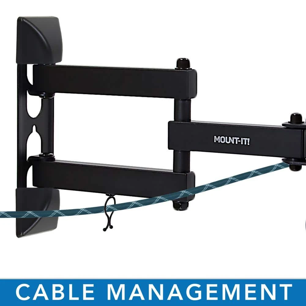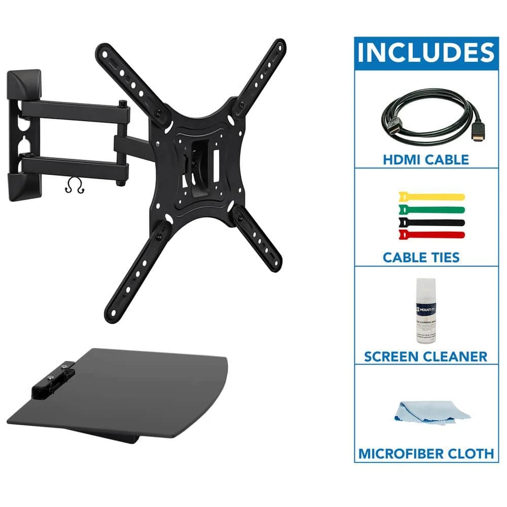 The MI-894 full motion TV wall mount is compatible with screens from 23 in. to 55 in. The tilt and swivel features will help you find the perfect viewing angle. Reduce glare and eye strain by tilting the screen. The included shelf conveniently holds your AV components within easy reach of your TV for an easier connection. This full motion TV mount allows for maximum viewing flexibility. Upgrade your entertainment center with this TV wall mount with shelf for a clean, sleek and minimalist look.