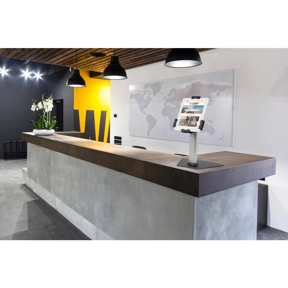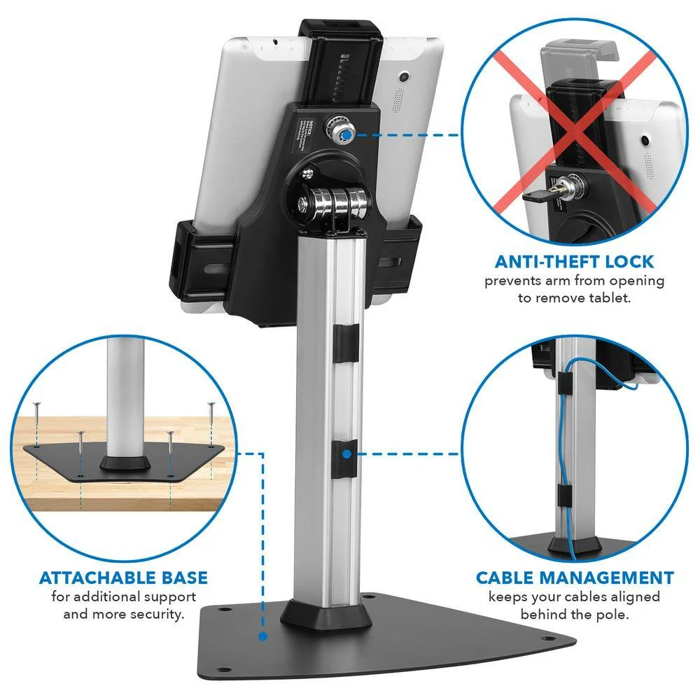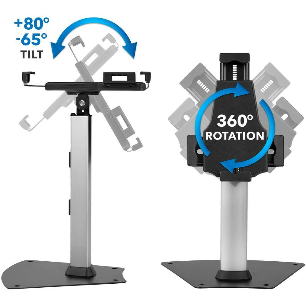 A retail inspired universal tablet stand highlighted by the tilting, swiveling and rotating anti-theft tablet holder. With the easy-to-use locking tablet mount you will speed up the checkout process, increase shopper engagement, loyalty sign-ups, and guest registration. Made from high grade materials with a matte finish, this tablet stand and wall mount is perfect for any setting.