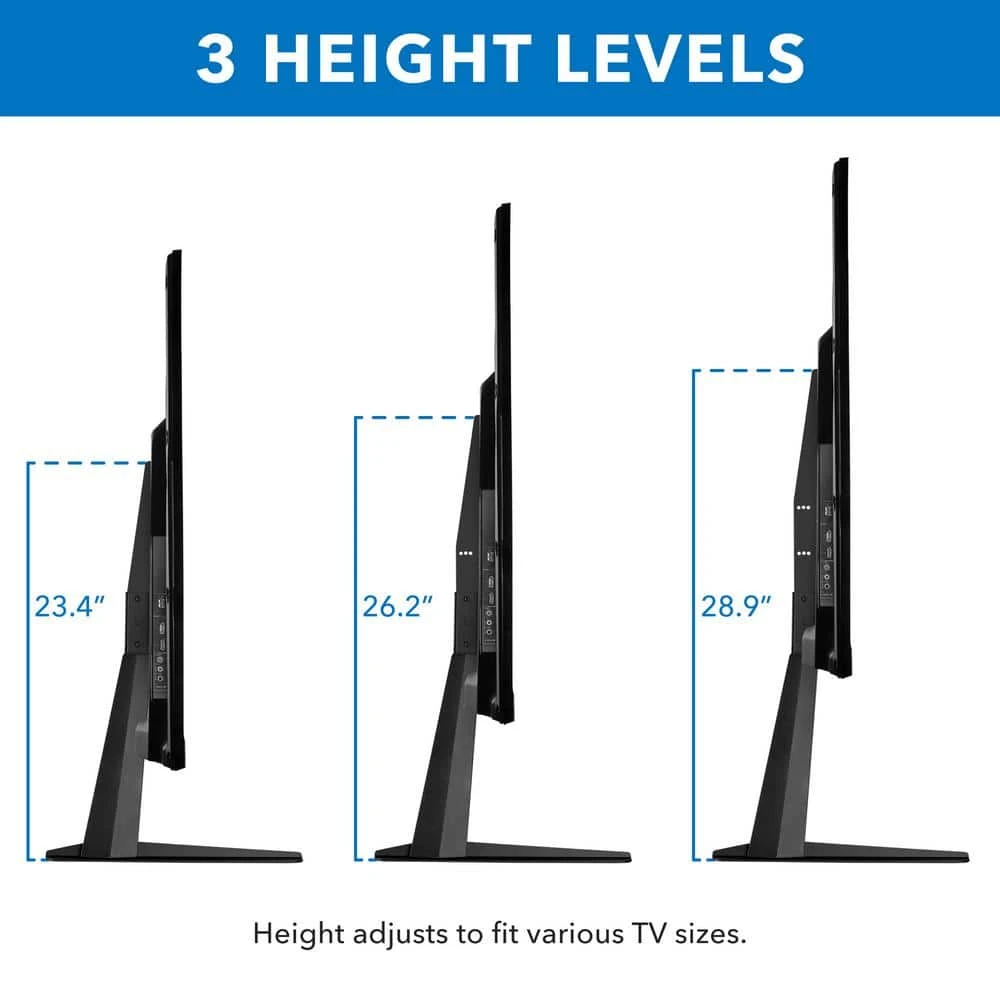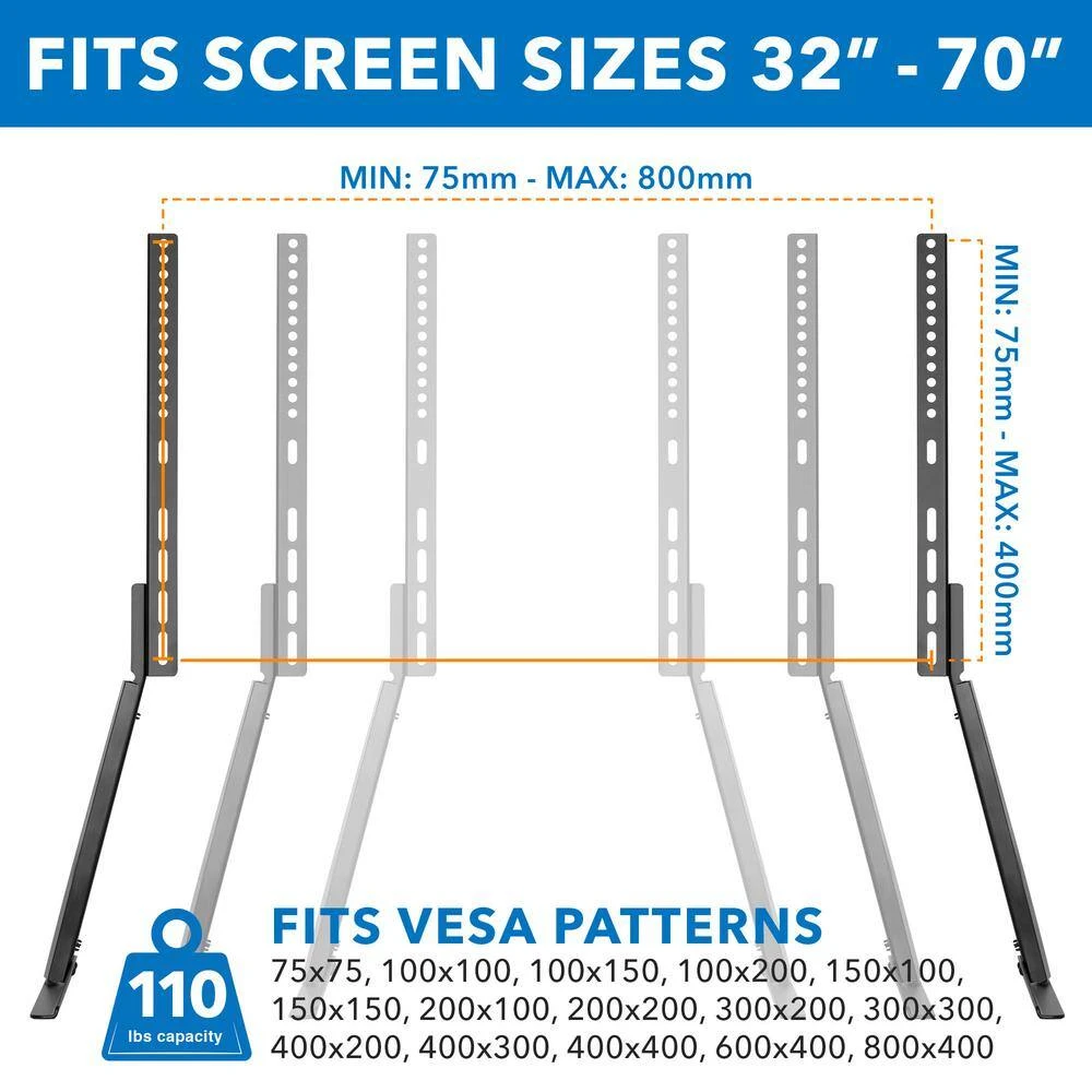 This universal TV stand can support up to 110 lbs., which includes even the largest televisions. Multiple installation holes and 3 height levels allow you to achieve the perfect TV alignment. Tilt your screen up or down to reduce glare. Hide cables inside the legs to keep them out of sight. The padded base ensures your dresser or entertainment stand is not scratched.